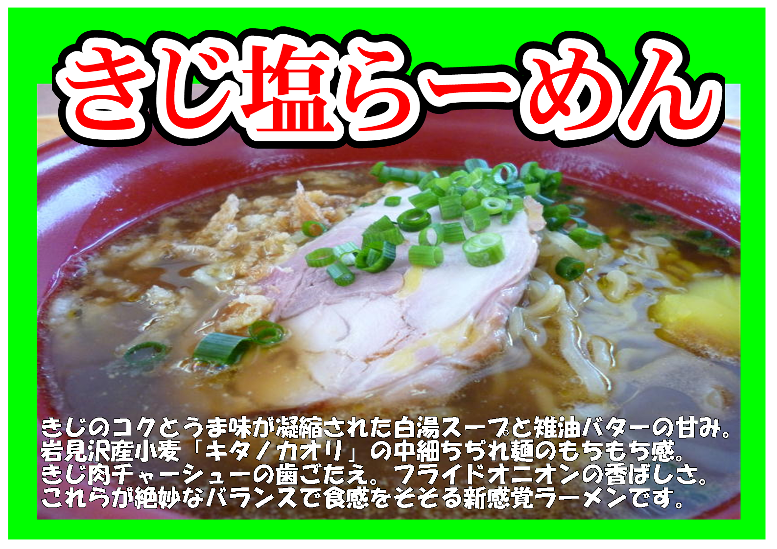 メニュー:「きじ塩らーめん」「生ビール」の販売を行います🍜🍺